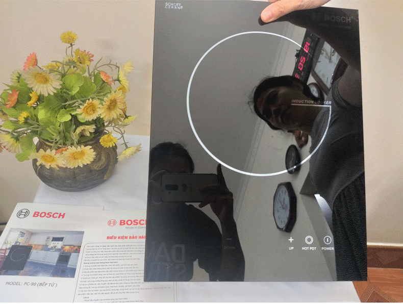Bếp từ đơn Bosch PC-90 có thiết kế vô cùng cao cấp, sản phẩm được sản suất với kiểu dáng hình hộp chữ nhật, mặt trên làm bằng kính trống xước cao cấp, mặt dưới làm bằng nhựa cứng vô cùng chắc chắn.