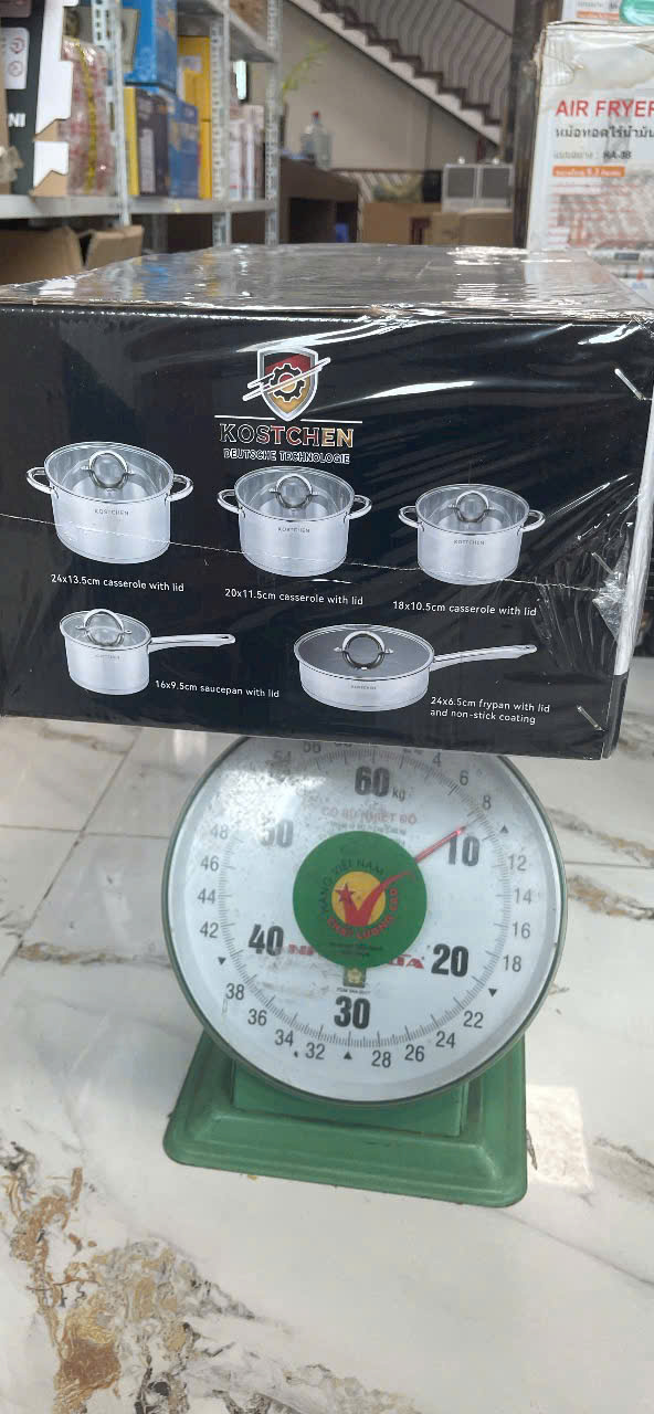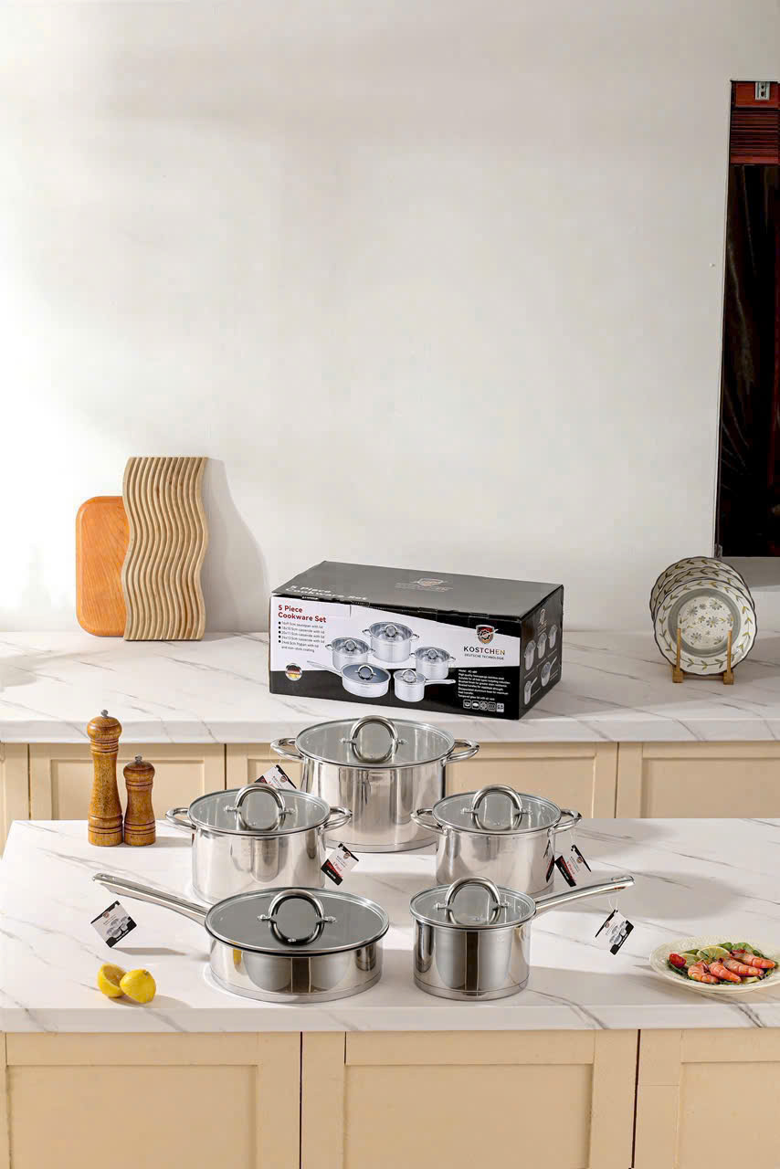 - Bộ nồi 5 chiếc Kostchen cao cấp thương hiệu Germany CHLB Đức chất liệu inox 304, không hoen rỉ, sử dụng cho mọi loại bếp ga,từ,hồng ngoại. Thiết kế đáy nồi 9 đáy dầy dặn, bắt nhiệt nhanh, tản nhiệt đều khi nấu ăn.