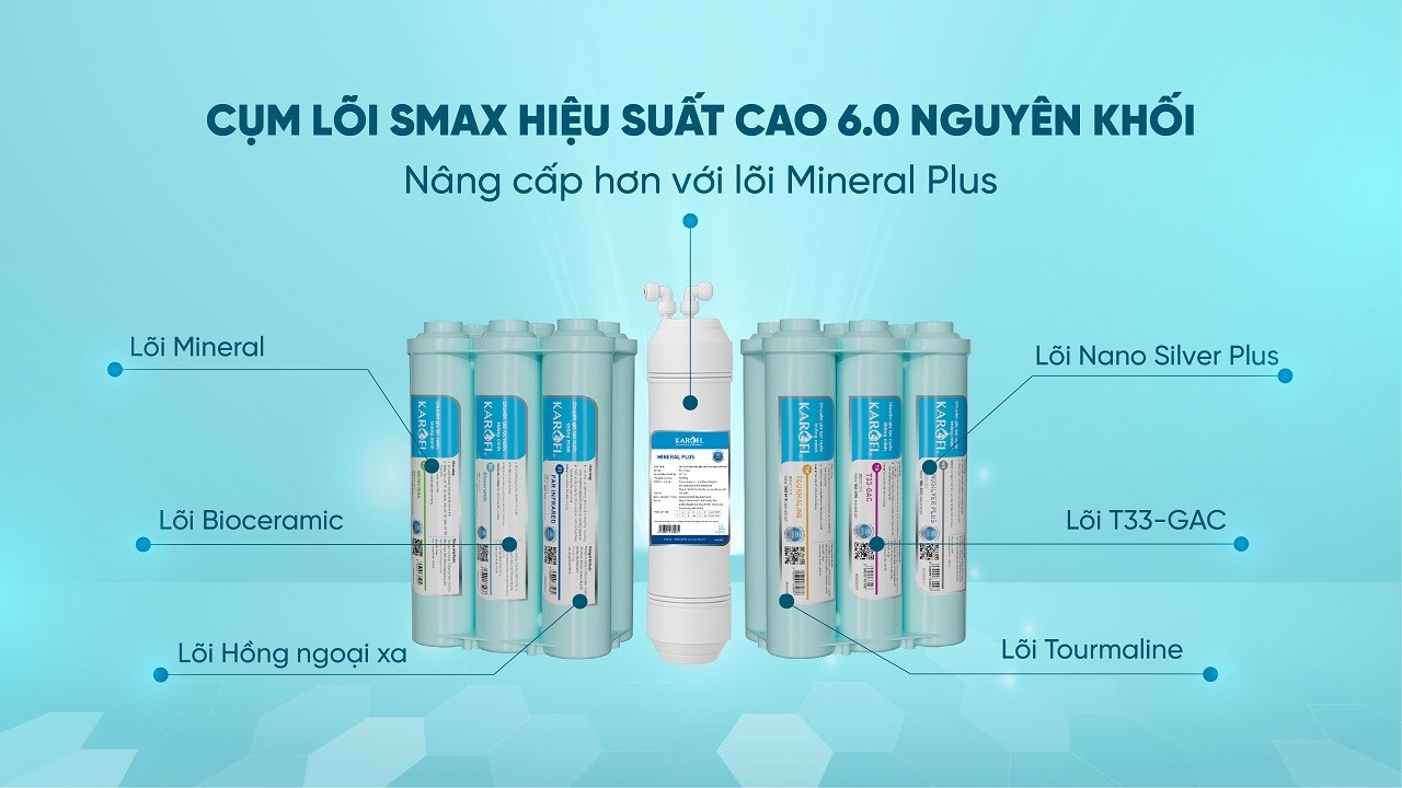 Gồm lõi Smax RO Purifim sản xuất tại Mỹ là trái tim của máy lọc nước, giúp loại bỏ hơn 99,99% clo, dầu, virus, vi khuẩn, amip, asen, các ion kim loại và các chất độc hại trong nước.