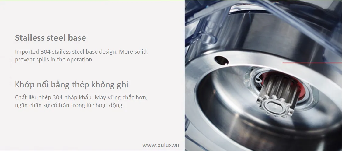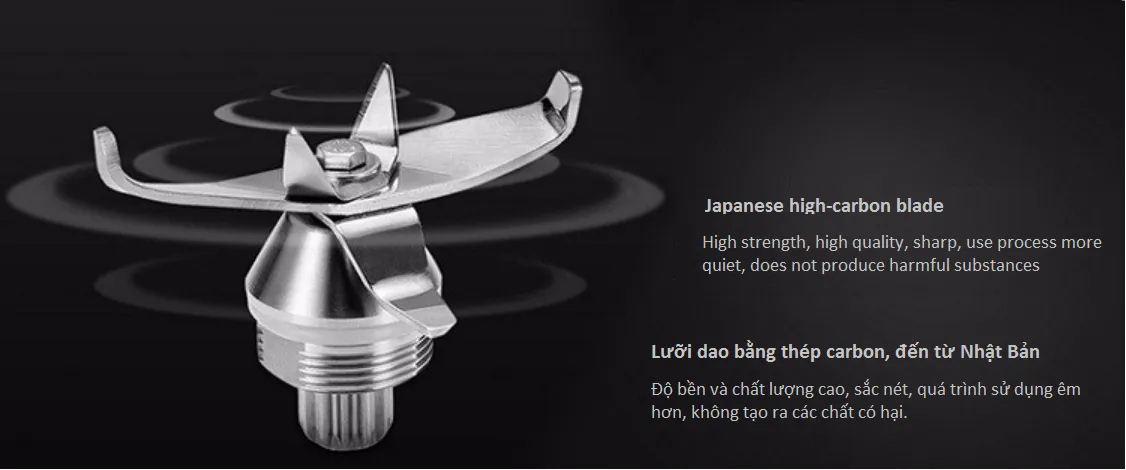 Thiết kế 6 cánh phủ nhiều hướng nên vừa có chức năng xay, vừa có chức năng đảo Vòng bi nhập khẩu từ Nhật Bản Với đặc thù máy công suất lớn, nên vòng bi phải là loại cực tốt nên máy mới chịu được, chính vì thế nên được nhập khẩu từ Nhật Bản. Chất liệu inox 304 cao cấp, do được làm từ Nhật Bản nên chịu được tốc độ 45000 vòng/phút và rất êm khi vận hành