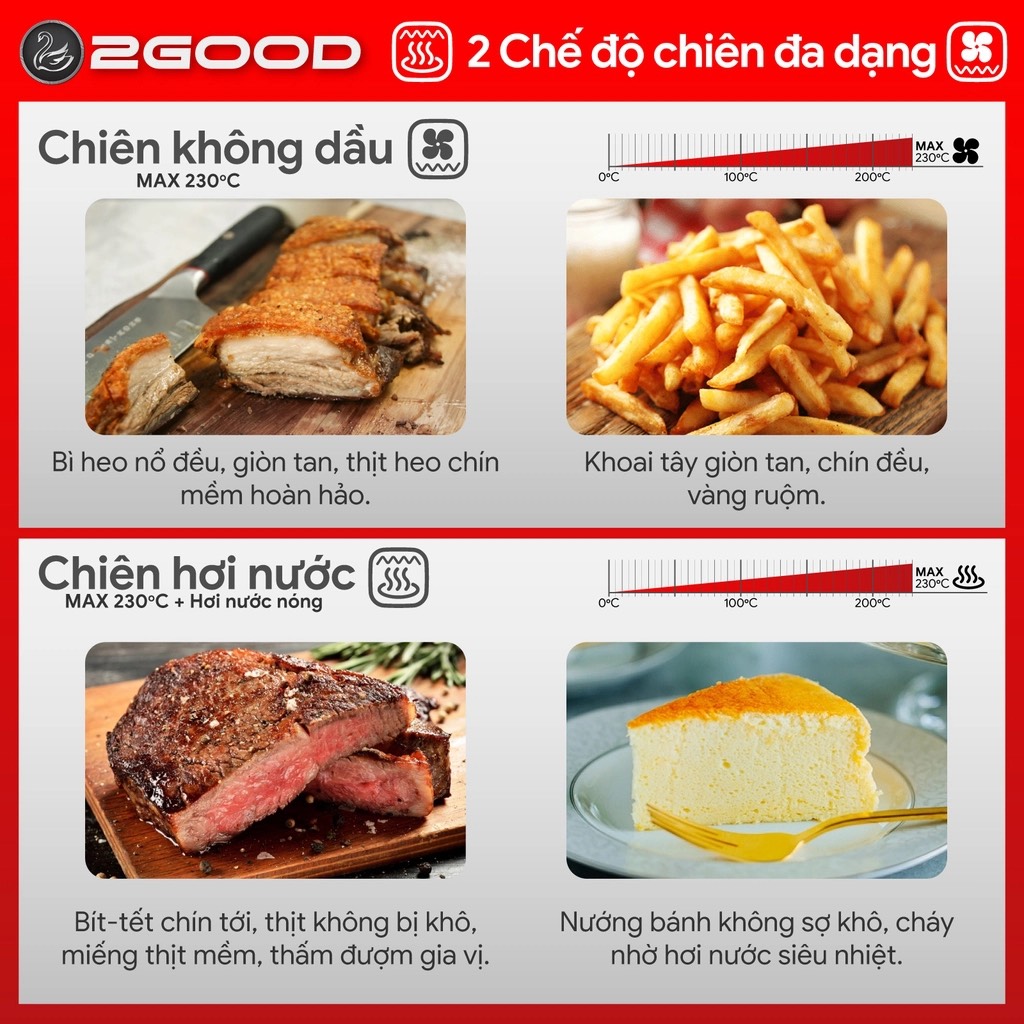 - 2 chế độ chiên nướng: Chiên không dầu giúp thực phẩm chín giòn, chiên hơi nước giúp thực phẩm chín mềm đều.