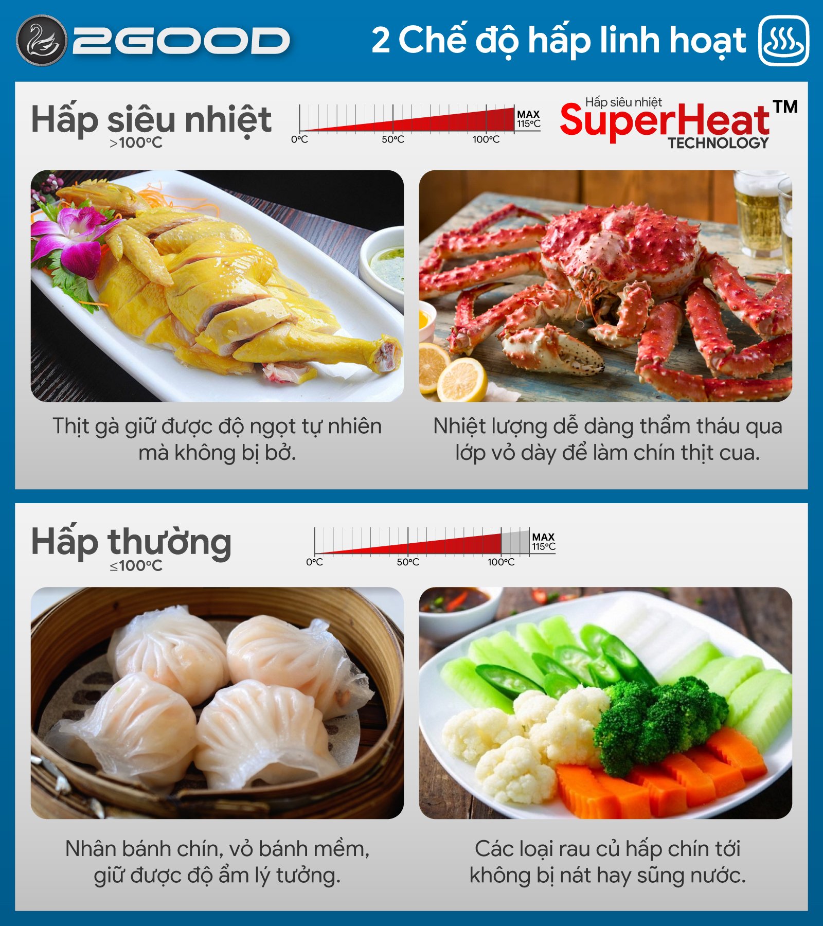 - 2 chế độ hấp linh hoạt: Siêu nhiệt >100 độ và hấp thường <100 độ.