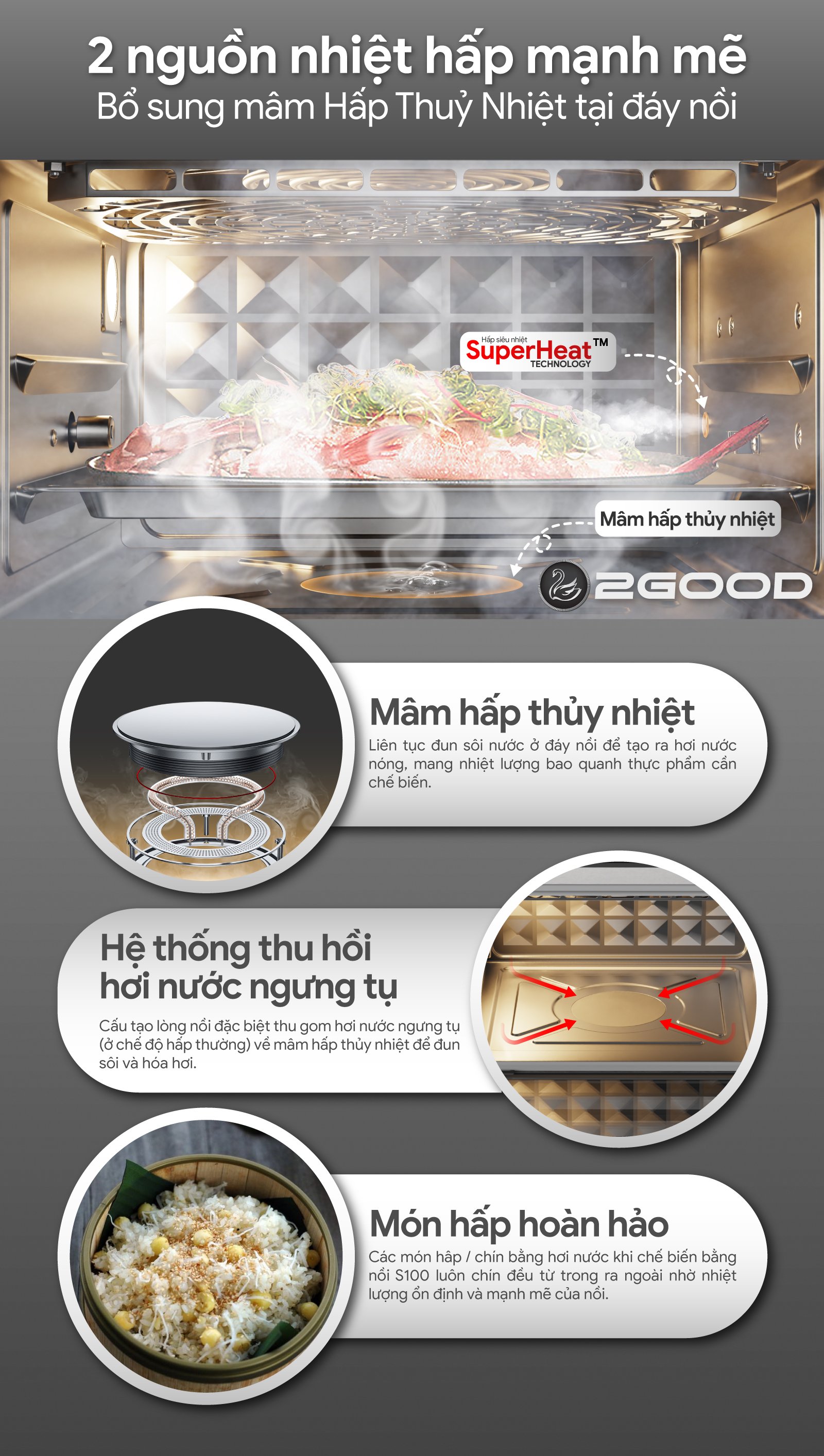 - 2 nguồn nhiệt hấp mạnh mẽ: Mâm hấp thủy nhiệt và đầu hấp siêu nhiệt.