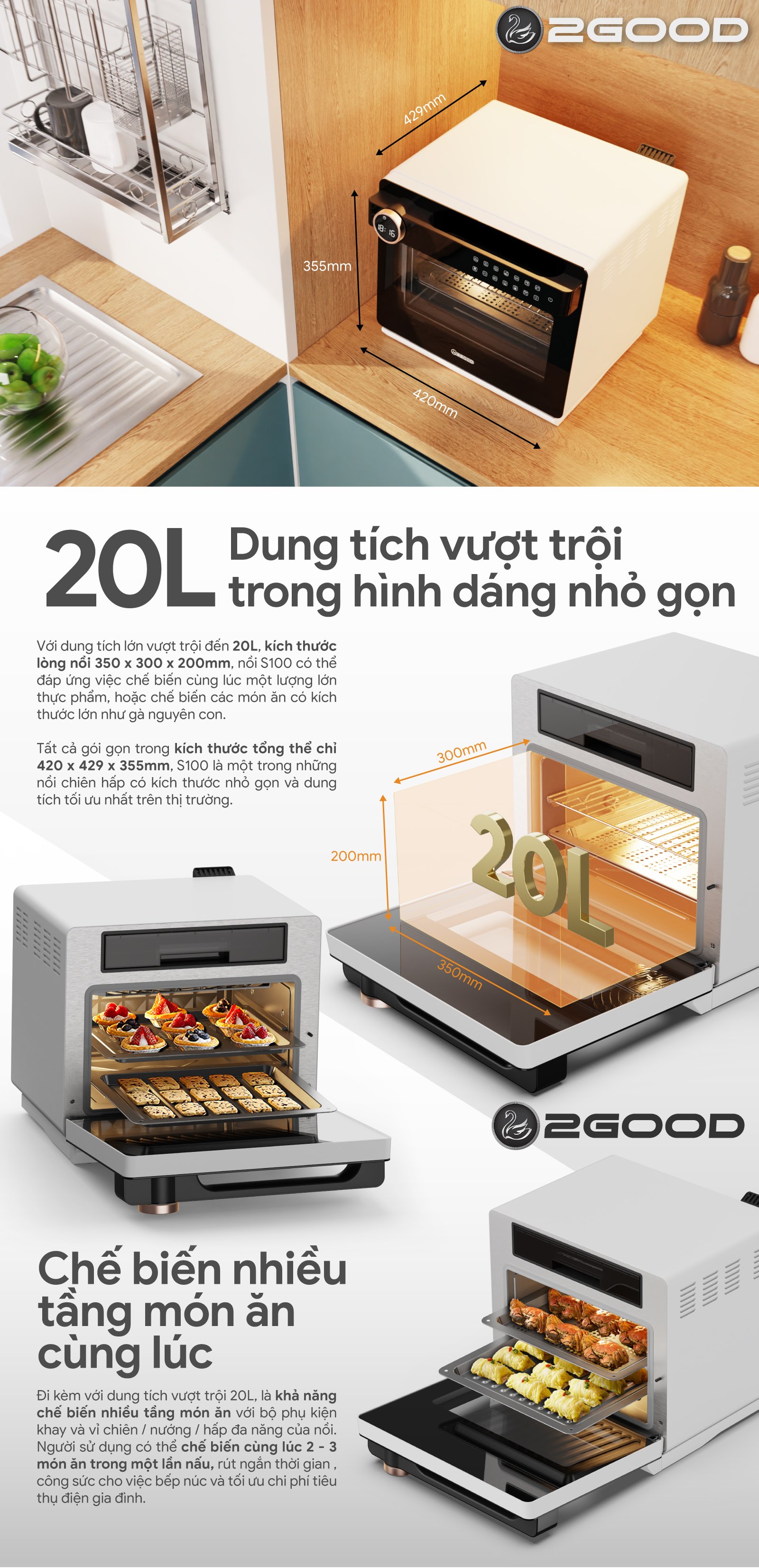 - Dung tích lớn 20 lít, giúp có thể chiên nướng cả 1 con gà, hoặc 2 -3 món ăn cùng 1 lúc nhờ thiết kế 2 tầng để thực phẩm