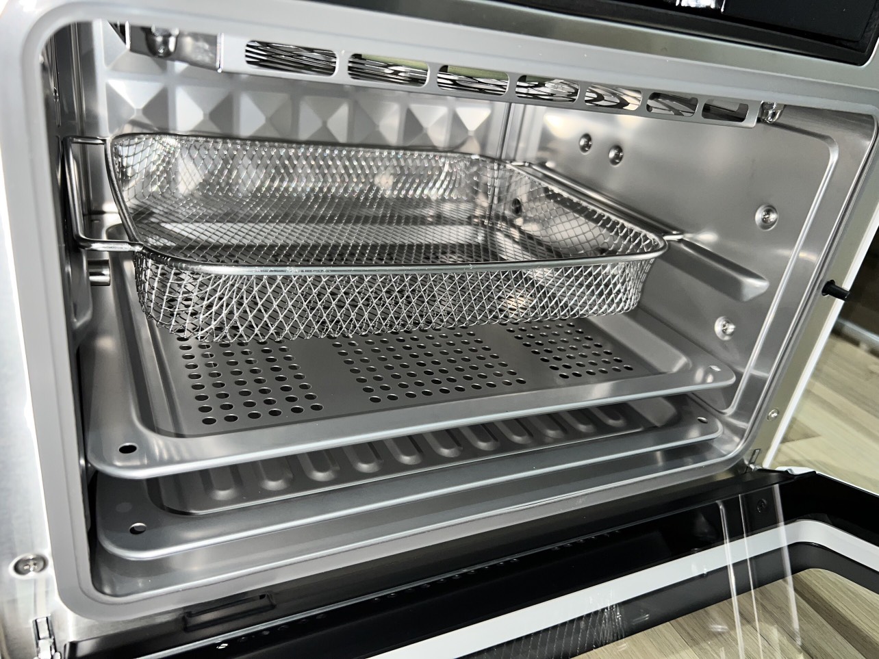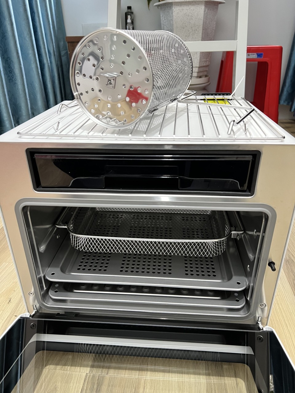 - Phụ kiện: Lồng đảo 360; vỉ chiên nướng; lồng quay chiên khoai tây; khay hứng dầu; khay hấp; dụng cụ nâng gắp; xiên quay gà và ghim.