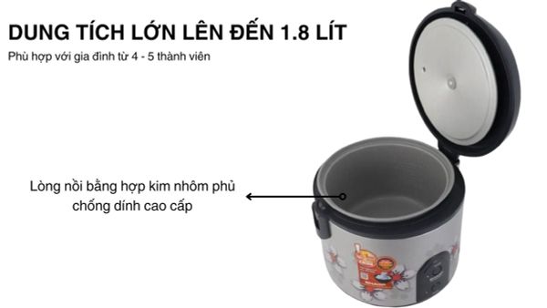 Thiết bị có dung tích 1.8 lít, phù hợp với gia đình từ 4 - 5 người giúp bạn có thể nấu cơm với khối lượng lớn mà vẫn đảm bảo độ chín và thơm ngon của cơm. Điều này mang lại sự tiện lợi và đa dạng trong việc chế biến các món ăn cùng với cơm cho cả gia đình.